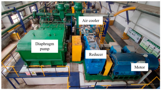 To demonstrate the feasibility and effectiveness of a methodology, this study utilizes vibration signal data obtained from the DGMB580-9A diaphragm pump at Fusheng Aluminum Industry in Yuncheng City, Shanxi Province, manufactured by Shenyang Pump Industry in May 2014, for experimental validation. The equipment comprises a drive system, a transmission system, a pump head system, and a control system, represented in Figure 2 and Figure 3. Specifically, the drive system is composed of a motor and the connecting components responsible for providing power to the pump. The transmission system incorporates a gearbox and a camshaft, with the gearbox designed to adjust the output torque by reducing the motor speed. The pump head system is the primary system of the diaphragm pump, consisting of a diaphragm, pump chamber, valve, and pump body. Finally, the control system is principally governed by the controller, which serves to regulate and manage the operational functions of the pump. The code runs on a 64-bit Windows 10 operating system installed on a laptop with an Intel Core i5-12400 processor, Intel UHD Graphics 730, and 16 GB of RAM.