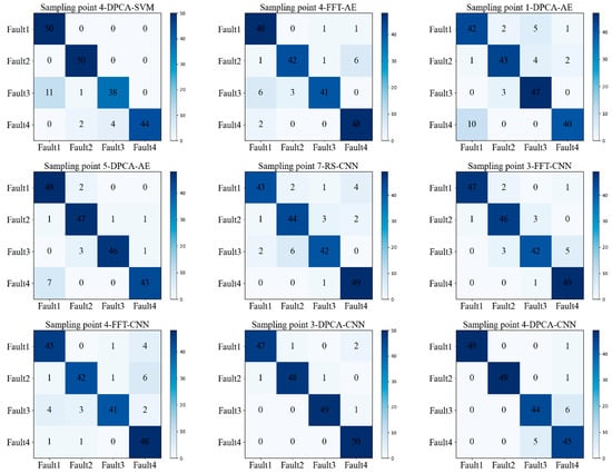 The test dataset was input into 72 trained recognition models, resulting in 72 confusion matrices of classification results. Then, we calculated the F1 scores of these matrices and selected the nine models with the highest F1 scores. These selected models and their corresponding confusion matrices for the test dataset are summarized in Table 2 and shown in Figure 4, respectively.