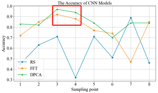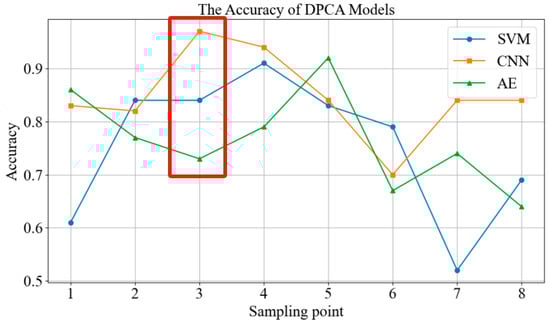 In order to further compare the recognition characteristics of different diagnostic models, two sets of comparative experiments were established. Firstly, a comparison of the impact of different feature extraction methods on diagnostic accuracy under CNN neural network conditions. Secondly, after performing DPCA on the collected signals, a comparison of the impact of different deep learning networks on diagnostic accuracy. The comparison results are shown in Figure 5 and Figure 6. The DPCA method has higher diagnostic accuracy than the original signal and the FFT signal at most sampling points, with average increases of 26.25% and 7.25%, respectively. CNN networks have significant advantages over SVM and auto encoders, with average diagnostic accuracy increases of 9.38% and 7.25%, respectively.