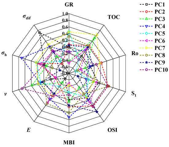 The principal component feature vectors are illustrated in Figure 3. Based on the coefficients of each factor corresponding to each principal component, expressions for the principal components can be constructed. For example, Principal Component 1 can be expressed as: PC1 = −0.012GR − 0.155TOC − 0.126Ro + 0.141S1 + 0.114OSI + 0.007MBI − 0.602E − 0.222ν − 0.016σh + 0.708σdif. Mechanical parameters such as Young’s modulus and the coefficient of variation of horizontal principal stress contribute the most to Principal Component 1, indicating that production is a comprehensive reflection influenced by multiple factors. Although the correlation between reservoir mechanical parameters and production is relatively weak, it still contains a considerable amount of significant feature information.