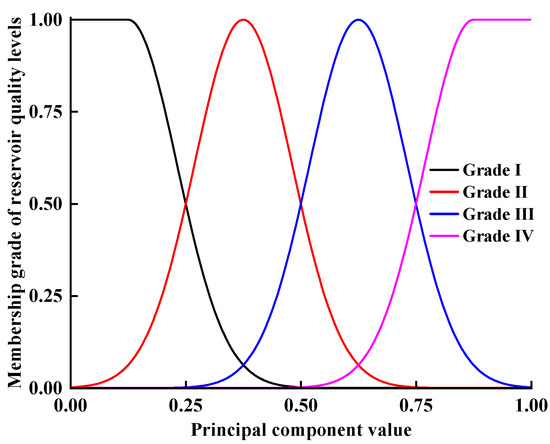 The evaluation set is utilized to discern the excellence or inferiority of determining factors. For the sake of providing an intuitive scoring system, the following definitions were established: Grade I = “Excellent” = 100, Grade II = “Good” = 75, Grade III = “Ordinary“ = 50, Grade IV = “Poor” = 25. In accordance with the evaluation set and its partitioning of reservoir quality, these four evaluation grades correspond to numerical ranges of principal component values (0 to 0.25, 0.25 to 0.50, 0.50 to 0.75, and 0.75 to 1). Based on Equation (7), Gaussian-shaped membership functions for each grade can be constructed, as illustrated in Figure 4.