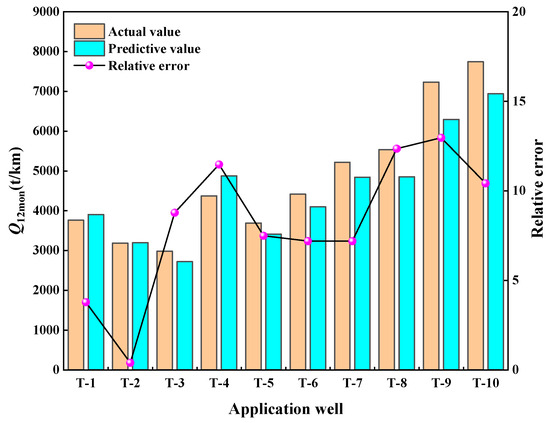 Comparative between actual production and predicted production. By inputting the evaluation factors of the 10 wells into the model to predict production, the relative errors range from 0.39% to 12.96% when compared with the actual production. This suggests a promising prospect for the practical application of the model in the field.