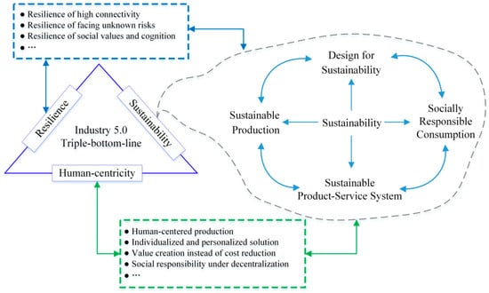 More recently, the Industry 5.0 concept [] was forwardly proposed on the assumption that Industry 4.0 is believed to promote sustainable development, but it has ignored or misunderstood many prevailing sustainability concerns. Other scholars may prefer to label it as Industry 4.0 Plus, Industry 4.0 Symmetrical, Industry 4.0-S, or using other terminology, the key of which is to encourage a departure from uncritical thinking and narrow epistemologies that currently dominate our understanding of science and technology []. In a brochure published by the European Commission, Industry 5.0 is defined by a re-found and widened purposefulness, going beyond producing goods and services for profit, which embraces three core elements: human-centricity, sustainability, and resilience []. Sustainability emphasizes that a business focused solely on profit is increasingly challenging to sustain in a globalized and highly volatile environment. Resilience refers to the ability to deal with vulnerabilities that can occur on many levels, including the factory floor, supply network, and industrial system levels. The human-centric approach in industry puts core human needs and interests at the heart of the production process, instead of taking emergent technology as a starting point and examining its potential for increasing efficiency. For an industry to become a provider of true prosperity, it must include social, environmental, and societal aspects. The essence of Industry 5.0 is the symbiosis of the three segments: technological, social, and ecological []. Leng et al. [] interpreted the connotation of Industry 5.0 as follows: Industry 5.0 prioritizes the welfare of workers by ensuring that manufacturing processes adhere to the ecological capacity of our planet, fostering a harmonious relationship between humans and machines to achieve societal goals beyond mere job creation and economic growth, ultimately advancing sustainable development toward a super-smart society with ecological values. Ivanov [] reckoned that Industry 5.0 spanned three levels, society, network, and plant, and forms a new TBL of resilient value creation, human well-being, and sustainable society.