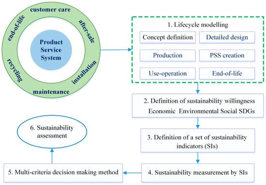 Second, the sustainable product–service concept driven by the coupling of technology and value is not yet mature for wide acceptance and practice. As mentioned above, because the production paradigm in the era of Industry 5.0 is mass individualization or mass personalization, the whole process will appear creative in design and complex in manufacturing. Mass personification allows the customers to customize the individualized product through digital technologies and e-commerce, while smart customization means providing smart user toolkits for co-design. Therefore, the customer can influence the product development before and after the purchase. This requires the deep coupling of the technology-driven and value-driven methods to fulfill the whole individualized manufacturing process in a reorganized symbiosis. One promising approach to tackle these challenges is the adoption of product–service systems (PSSs) []. A PSS is a value proposition that aims to provide user satisfaction by delivering an integrated system of products and services. If properly designed, PSS can create economic and competitive incentives for stakeholders to continually improve sustainable resource management practices. Recognizing the growing demand for customized products, manufacturers are shifting from a high-volume, low-variety production model to a low-volume, high-variety model []. The solution lies not only in making production methods more ecologically sound but also in influencing consumer behavior through the introduction of environmentally responsible products, services, and practices. Therefore, the successful implementation and widespread adoption of PSS innovations require collaboration among multiple actors rather than relying on a single entity or small network. Servitization is a business strategy that involves shifting focus from selling products to providing services and solutions that meet the needs of customers. Despite the potential benefits and driving factors mentioned above, the diffusion of sustainable product–service systems (SPSSs) remains limited.