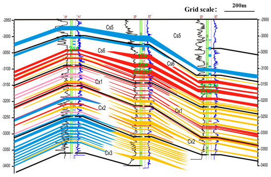 Log interpretation 17# of the CS6 sand group in well LN-1 has a large lateral change, with well LN-3 pealing out and well LN-5 thinning. And, logging interpretation 22# has a relatively good lateral stability as shown in Figure 2.