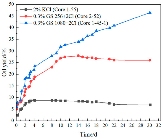 The oil production effect of 2% KCl solution with GS-1080 and GS-256 added is more obvious, as shown in Figure 5. When the solution contains a small amount of GS-1080 (0.3%) and GS-256 (0.3%), the core oil yield increases significantly. For the GS-1080-soaked core, the oil yield continued to increase, and when soaked 30 days after the core surface was clean, no residual oil droplets were found in the bottle; oil yield increased up to 46.53%, and the washing effect was good. Among the three soaked cores, the core soaked by GS-1080 has the lowest permeability and the highest oil yield. In summary, GS-1080 has the best oil washing effect.