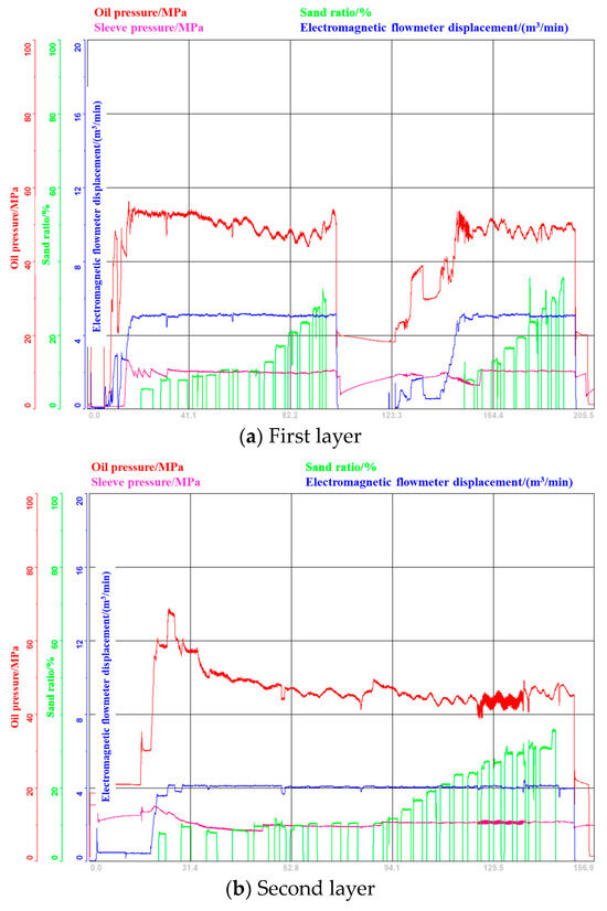 The two-layer fracturing was completed on 27 September 2019. As shown in Figure 8a, the first layer, with a fracturing pump displacement of 5 m3/min, added 6 m3 of 40/70 mesh proppant and 49 m3 of 20/40 mesh proppant. Rupture pressure was 57 MPa, construction pressure was 45–55 MPa, stop pump pressure was 22 MPa, and 390 kg of fiber was added in this process.