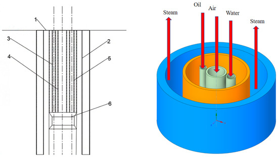 Heavy oil represents a significant portion of the world’s oil and gas resources due to its abundant reserves, making it a crucial energy source in the 21st century [1,2]. Currently, heavy oil extraction primarily relies on conventional cold extraction methods, which appear to have a low efficiency [3]. Chinese researchers have developed a multi-thermal fluid injection thermal oil extraction method based on steam injection technology to enhance the efficiency of heavy oil extraction [4,5,6]. Multi-thermal fluid technology is a widely used method for heavy oil extraction. It utilizes the synergistic effect of N2, CO2, and steam to reduce the viscosity of heavy oil, minimize energy loss during steam injection, and significantly increase the amount of oil extracted [7,8,9,10,11,12,13]. The DMTFG is a device that generates multi-fluid heat, including steam, N2, CO2, and other mixed fluids at high temperatures and pressures. It is a crucial component for heat injection and extraction, and a prerequisite for achieving the multi-fluid heat extraction of heavy oil [14]. The process involves injecting fuel oil, air, and steam from the surface into the DMTFG through three pipelines. The DMTFG then injects the multi-fluid directly into the oil formation, reducing heat loss during injection from the wellhead to the oil formation [15,16]. The packer is a crucial downhole tool in heavy oil production, as it significantly impacts the effectiveness of steam injection and the lifespan of the casing [17]. However, the steam produced by the wellbore multi-thermal fluid generator has the phenomenon of upward return from the annulus, which can damage the packer and affect the effectiveness of steam injection in the casing. Therefore, it is crucial to accurately predict parameters such as the temperature change of the steam in the wellbore and the distance of upward return to improve the heavy oil production process [18,19,20].
