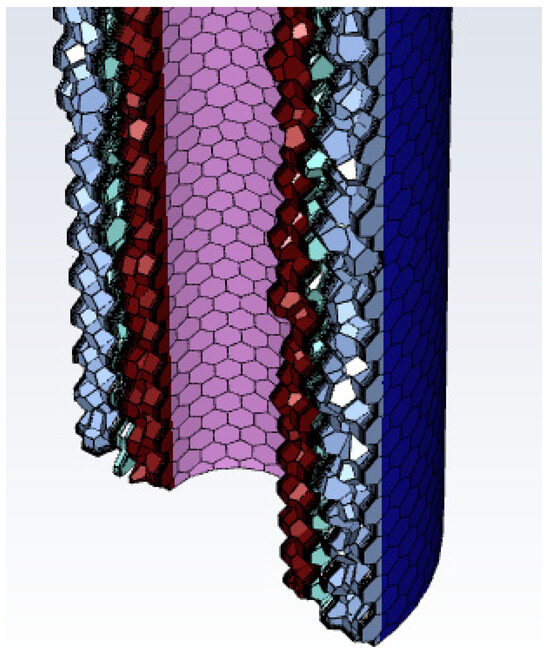 The models were modeled and meshed using space claim as well as ICEM software version 2021, respectively, to further verify the accuracy of the models. Structured hexahedral meshing was performed using ICEM software (Figure 7). Analyze the temperature variation of steam in the annulus at different well depths. The inlet boundary condition is set as the velocity inlet and the outlet boundary condition is set as the pressure outlet. The standard model of the k-ε model is applied for processing, and the standard wall function method is used at the near-wall surface. For the coupling of velocity and pressure, the SIMPLEC method is used, and the first-order windward form is adopted for each discrete equation. During the iterative operation, the calculation convergence is judged based on the residuals falling below 10−6.