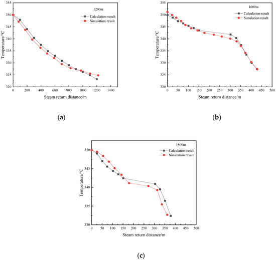 The 1200 m, 1600 m, and 1800 m well models were created using ANSYS, and the simulation calculations were performed using the Fluent module. From Figure 9, it can be seen that the distance of the upward return of steam calculated by the DMTFG heat transfer model is basically the same as that obtained from the simulation, which verifies the accuracy of the model.