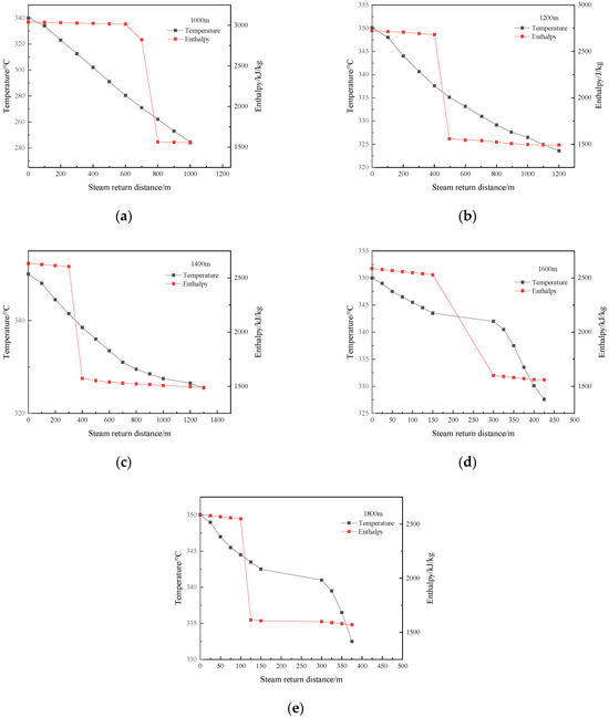 As the temperature gradually decreases, the steam condenses into water. When water steam condenses to water, the enthalpy drops rapidly. From Figure 10, it can be found that the deeper the location downhole, the earlier the point of decline in the enthalpy of the steam. This is because the deeper the location in the well, the higher the pressure at the same temperature. When the pressure is higher, the density of the steam is higher, and the water is more likely to condense into liquid water.