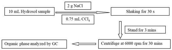For the sample preparation, we referred to a previous study [] and conducted certain optimizations based on them, the detailed steps were as follows: a 10 mL hydrosol sample was taken and mixed with 1.5 mL of acetone, followed by the addition of 2 g of NaCl. Subsequently, 0.75 mL of carbon tetrachloride was added to the mixture. The resulting solution was manually shaken 100 times and then subjected to scrolling for 30 s. After allowing the solution to stand undisturbed for 3 min, centrifugation was performed at a speed of 6000 r/min for 5 min. The organic phase present at the bottom of the centrifuge tube was carefully collected and transferred to an injection vial for further determination. Figure 1 shows the flow chart of sample pretreatment for 24 trace aromatic substances in rosemary hydrosol.