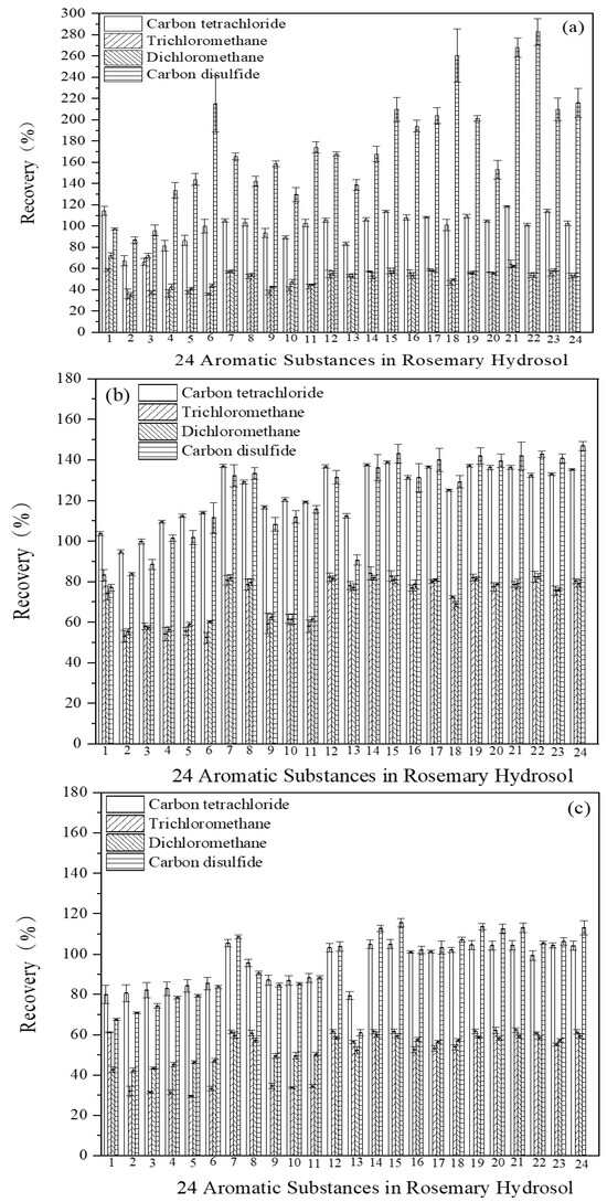 Selection of an appropriate extractant is crucial for the extraction process to ensure the complete dissolution of all standard substances. The solubility of the target substance in the chosen extractant should be significantly higher compared to water. Additionally, the density of the chosen extractant should be notably greater than that of water to facilitate efficient centrifugation and stratification post-extraction. In this study, trichloromethane, dichloromethane, carbon tetrachloride and carbon disulfide were chosen as the extractants. To evaluate the recovery rates of the 24 standard substances at different spiking levels, mixed standard solution spikes with concentrations of 1.5 μg, 15 μg and 150 μg were added to the blank matrix for each extractant tested. Comparisons were made between the recovery rates of the 24 standard substances across the various extractants and concentrations. The recovery rates of the 24 standard substances were presented in Figure 3a–c. Notably, when carbon disulfide was employed as the extractant, significant variations were observed among different analytes, which could be attributed to their varying solubilities in carbon disulfide. Consequently, carbon disulfide was excluded from consideration as an extractant in this study. Comparative analysis revealed that carbon tetrachloride exhibited significantly higher recoveries (around 100%) for the 24 analytes compared to dichloromethane and chloroform. Furthermore, the chromatographic peak of trichloromethane substantially overlapped with (±)-2-pinene, while dichloromethane demonstrated a propensity to emulsify with water when used as an extractant. Therefore, carbon tetrachloride was selected as the preferred extractant for this investigation.