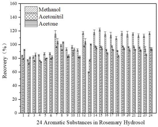 In order to facilitate the transfer of target analytes between the aqueous and organic phases, it is crucial for the dispersant to possess favorable solubility in both water and the chosen extractant. Additionally, the dispersant should demonstrate excellent solubility in the 24 reference materials. For the purpose of this study, acetone, hexane and methanol were carefully chosen as the dispersants for comprehensive evaluation. To evaluate the recovery rates of the 24 analytes at different concentrations, a standard solution containing 15 μg was added to the blank matrix using each dispersant. The main objective was to compare the recovery rates of the 24 analytes across various concentrations and dispersants, with the ultimate goal of identifying the most suitable dispersant that could effectively facilitate the smooth transfer of the reference materials between the aqueous and organic phases while achieving optimal recovery rates. The recovery rates of the 24 standard substances are presented in Figure 4. When methanol was utilized as the dispersant, it led to a higher migration of cis-3-hexene-1-ol into the water phase, resulting in an insufficient recovery rate of the spiked compound. Conversely, when acetone was used as the dispersant, the recovery rate of the added standard exceeded that of acetonitrile. Additionally, it was observed that acetonitrile had a propensity to cause losses in the gas chromatographic column. Consequently, acetone was chosen as the preferred dispersant for this study.