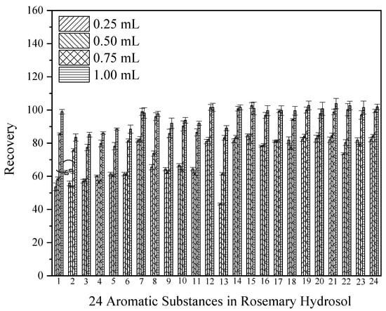 The volume of the dispersant plays a crucial role in determining the efficiency of extraction. Insufficient dispersant volume can hinder the rapid transfer of the target substance between the aqueous and organic phases, while excessive dispersant volume can result in a larger organic phase volume and reduced enrichment factor. Moreover, some dispersants may dissolve in the water phase after microextraction, leading to the loss of target substances and lower recovery rates. In this study, acetone was chosen as the dispersant. Each volume of dispersant was added to the blank matrix containing 15 μg of the mixed standard solution. The recovery rates of the 24 standard substances when varying the volume of acetone dispersant to 0.75, 1.0, 1.5 and 2.0 mL, respectively, are shown in Figure 6. It was observed that there was minimal variation in the recovery of the 24 reference materials as the volume of dispersant changed. Therefore, for this study, a volume of 1.5 mL was selected as the appropriate amount of acetone dispersant.
