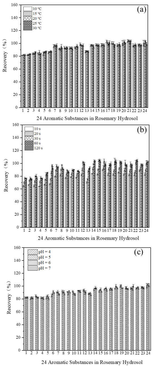 The pretreatment parameters of DLLME, including extraction time, temperature and pH value, may affect the extraction recovery of the 24 target analytes in rosemary hydrosol samples. So, in this work, the parameters of extraction time (10, 20, 30, 60, 120 s), temperature (10, 15, 20, 25, 30 °C) and pH (4, 5, 6 and 7) were optimized. As shown in Figure 7a, extraction temperature had a minimal impact on the recovery rate of analytes, so the extraction experiments can be conducted at room temperature (10–30 °C). As for the extraction time (see Figure 7b), the extraction efficiency gradually increases when the extraction time is between 10 and 30 s, and it stabilizes when the extraction time is between 30 and 120 s. According to the principles of DLLME, the dispersant transfers multiple times between the sample and the extraction solvent during the extraction process. The target analytes are quickly extracted from the sample into the extraction solvent. This is one of the advantages of DLLME compared to other extraction methods. Thus, 30 s was chosen as the optimal extraction time. Moreover, as can be seen from Figure 7c, pH had a negligible effect on the recovery rate when the pH value was in the range of 4–6. Consequently, there was no requirement for pH adjustment during the analytical determination of the sample.