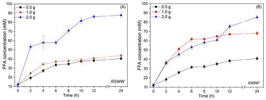 The higher hydrolytic activity provided was effective for the RSSW (Figure 1A), with a maximum FFA formation of 85.34 ± 2.59 mM. However, a better performance was observed in the system with 1.0 g of biomass, showing a profile similar to the 2.0 g system up to 10 h of operation. However, after this time, the FFA formation stabilized for 1.0 g of the biocatalyst, reaching only 68.12 ± 0.36 mM, whereas the reaction with 2.0 g of biomass increased from 60.84 to 85.34 mM.