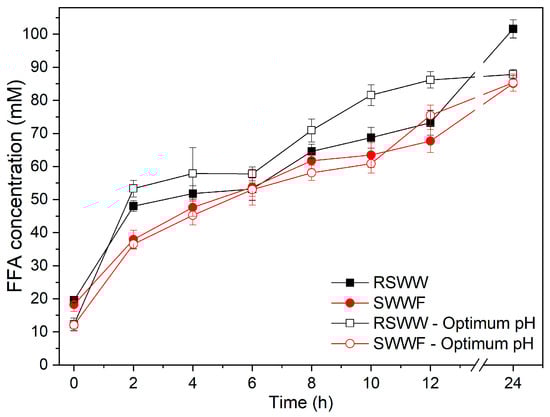 Based on the results of the influence of pH shown in Figure 2, the hydrolysis profile presented by RSWW with an adjusted pH was slightly higher than that presented by the original pH (6.15) for up to 12 h of the reaction, but, after the first 12 h, the hydrolysis of RSWW without an adjustment of pH had a maximum FFA formation of 101.62 ± 0.75 mM, while the pH-adjusted system had a maximum conversion of 87.85 ± 0.48 mM. For SWWF, the hydrolyses without (pH 7.59) and with a pH adjustment were also similar, reaching values close to optimal FFA formation at the end of 24 h of reaction; values of 85.11 and 85.34 mM, respectively. The small differences in the hydrolysis process of the SWWs may have been due to the close pH values of the SWWs to the optimum pH of the enzyme, thus the lipase could act in a similar way in both study conditions; therefore, as the pH adjustment did not provide a considerable increase in the formation of FFAs, the other tests continued without pH adjustment.