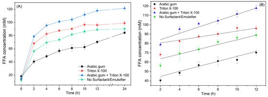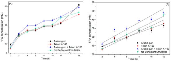 The combined action of Triton X-100 + arabic gum resulted in the highest FFA formation when compared to the use of the biosurfactant and emulsifier individually, with a maximum production of 121.38 ± 1.60 mM. This outcome may indicate that both components promoted a better stabilization of the formed emulsions, consequently enhancing the lipase-catalyzed reaction. The data also suggest that, at least within the initial 12 h of the reaction, Triton X-100 might have had a better role in stabilizing the water/lipid interface. This is supported by the fact that, when used individually, Triton X-100 led to higher FFA formation compared to the results of arabic gum alone.