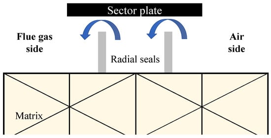 Direct air leakage manifests as a consequence of the ingress of high-pressure air into the low-pressure flue gas domain through the gaps formed between the rotor and stator. This phenomenon establishes a discernible leakage pathway, delineated by the space between the sealing mechanism and the sector plate. Figure 1 represents a side view of air leakage dynamics at the hot end of the air preheater, depicting the intricate interplay between the radial seal and the sector plate when utilizing a dual seal configuration.