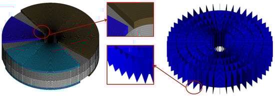 To analyze the thermal deformation of the rotor, a three-dimensional model of the rotor’s fluid–solid coupling using SolidWorks was established based on the structural parameters of the air preheater in Table 1. The model includes a solid domain, which comprises the rotor center cylinder and the segment plates, along with a fluid domain. Afterwards, ICEM was utilized to conduct hexahedral structured meshing of the computational basin inside the rotor of the air preheater. In addition, the hexahedral dominated swept mesh method was employed to mesh the solid domain in ANSYS Workbench’s mesh module to achieve discretization of the computational region. The meshing results are displayed in Figure 3.
