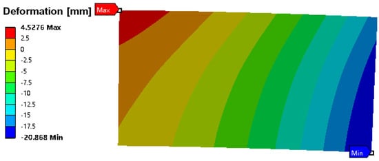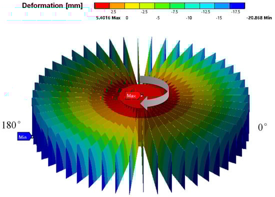The axial thermal deformation distribution contour of the segment plate with the maximum sagging deformation is depicted in Figure 8. To facilitate observations, the deformation of the rotor has been magnified by a scale factor of 5. It is evident that the axial deformation of the segment plate gradually increases along the radial direction, with the maximum axial deformation occurring at the outer edge of the segment plate. Specifically, the maximum axial deformations at the cold and hot ends are −20.868 mm and −16.171 mm. Due to the overall expansion tendency of the rotor’s central cylinder, the axial deformation magnitude at the outer edge of the hot end of the segment plate is smaller than that at the cold end.