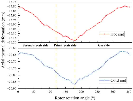 - This study elucidates the influence of the RAPH rotor’s rotation angle on the axial deformation of the segment plates at both the cold and hot ends. The distribution of thermal deformations on the radial segment plates exhibits circumferential asymmetry. Starting from the flue gas to the primary air transition interface, the axial deformation of the segment plates at both ends initially increases and then decreases with the rotation of the rotor. Under the design conditions, the average thermal deformation at the outer edge of the rotor’s hot end is −15.97 mm, while at the cold end, it is −20.73 mm. The maximum axial deformation for each radial segment plate occurs at the outer edge of the cold end. Specifically, the maximum axial deformation at the cold end and hot end is −20.868 mm and −16.180 mm, respectively.
