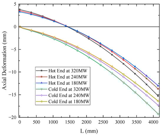 To assess the impact of rotor thermal deformation on the air leakage gap, this study conducted temperature–structure coupled simulation calculations on the air preheater under three operating conditions with power plant loads of 320 MW, 240 MW, and 180 MW. Figure 9 illustrates the deformation curves of the segment plates at the hot and cold edges at the air–gas transition interface for these three conditions. The results indicate that with an increase in load, the thermal deformation of the air preheater rotor becomes more pronounced. The primary factor influencing the thermal deformation due to the air preheater load is the load, determining the temperature difference between the hot and cold ends. As the temperature difference increases, the axial deformation of the rotor segment plate’s outer edge exhibits a gradually increasing trend. Additionally, for the hot end of the air preheater, the deformation distribution curves of the segment plates along the radial direction intersect near 1500 mm, where the deformation is nearly zero. When L < 1500 mm, the axial deformation is positive due to the expansion of the center cylinder, while at L > 1500 mm, the segment plate undergoes downward deformation. It should be noted that the model was simplified by setting the expansion dead point at the cold end inner edge of the rotor’s center cylinder. Due to the fixed support at the cold end of the rotor, the axial deformation values at this location are consistently zero under different loads.