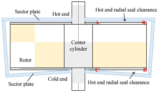 Thermal deformation of the hot end of the rotor’s segment plate leads to a significant and narrow gap forming between the upper end face of the rotor and the sector plate, leading to air leakage. Meanwhile, the cold end’s thermal deformation can cause mechanical wear at the rotor’s outer edge. Fixed seals are frequently implemented to address these issues. As indicated in Figure 10, during the cold installation and adjustment of the air preheater, a reserved clearance is established based on the thermal operating parameters. This enables a certain level of relative displacement between the rotor and the shell in hot conditions, thereby mitigating the impact of thermal stress on the equipment. Take the example of a typical 300 MW-class plant equipped with a rotary air preheater. At A and B, the hot end reserved distance is 1.5 mm, while at C, the cold end reserved distance is 0 mm, and it is 19–22 mm at D. When the air preheater operates at a high temperature, the air leakage gap at the hot end is determined by the vertical distance between the upper sector plate and the upper edge of the segment plate. Simultaneously, the inner cold end gap is modified from 0 mm to the upward expansion value located at the bottom of the center cylinder, while the outer side inclination is altered due to the rotor and casing rotation. The cold end’s internal gap increases from 0 mm to the expansion limit at the bottom of the center cylinder, while the external side experiences near-zero gaps due to the rotor’s sagging deformation. Numerical simulations of rotor thermal deformation offer a dependable foundation for the customization of the cold reserved space and seal fittings, enabling efficient regulation and monitoring of the radial air leakage gap.