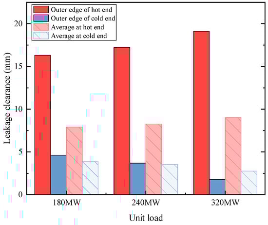 According to Equation (7), the direct air leakage is correlated with the pressure difference on the gas flue side and the air leakage gap, whereas the size of the air leakage gap depends on the thermal deformation of the rotor segment plate. Assuming an average reserved gap of 1.5 mm at the cold state of the hot end and an outermost reserved gap of 21 mm at the cold state of the cold end, the sealing surfaces are of equal height, comprising the sector plates between the primary and the flue gas side, as well as secondary air side. Based on the simulation results of rotor thermal deformation under different unit loads, a comparison of the radial air leakage gap size on the primary air side under different operating conditions is obtained, as shown in Figure 11. To more accurately quantify the air leakage gap in the air preheater, the air leakage outer clearance is defined as the distance between the radial end of the segment plate at the hot or cold end and the sealing plane of the sector plate. The average air leakage clearance is defined as the ratio of the leakage area to the length of the segment plate. This is distinct from previous studies that assumed a constant value for the gap, ignoring variations in the gap along the radial direction of the segment plate. Implementing this approach provides a more reliable reference for further optimizations of the design and ensuring the safe operation of the air preheater.