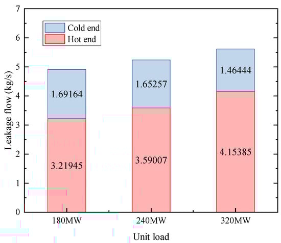 Figure 13 illustrates the variations in the radial air leakage distribution at the hot and cold ends under different unit loads. As the unit load for power generation increases, the hot-end air leakage volume rises, while the cold-end air leakage volume decreases. The proportion of hot-end radial air leakage in the total radial air leakage gradually increases from 65.54% to 73.93%, confirming the significance of hot-end radial air leakage as a component of the overall radial air leakage. Based on practical observations and the simulated results of rotor thermal deformation, it is evident that the hot-end air leakage clearance is significantly larger than the cold-end clearance. Consequently, under the same load, the air leakage volume at the hot end consistently surpasses that at the cold end. Furthermore, radial air leakage at the hot end results in the escape of preheated air, heated by flue gas, which bypasses the combustion system and instead leaks through the radial clearance at the hot end, leading to the wastage of a portion of heat. Therefore, in comparison to cold-end air leakage, air leakage at the hot end has a more pronounced impact on the heat transfer performance of the air preheater.