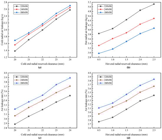 Effect of cold radial clearance on leakage characteristics. Effects of (a) outer radial clearance at the cold end and (b) average radial clearance at the hot end on air leakage. Effects of (c) outer radial clearance at the cold end and (d) average radial clearance at the hot end on the air leakage rate.