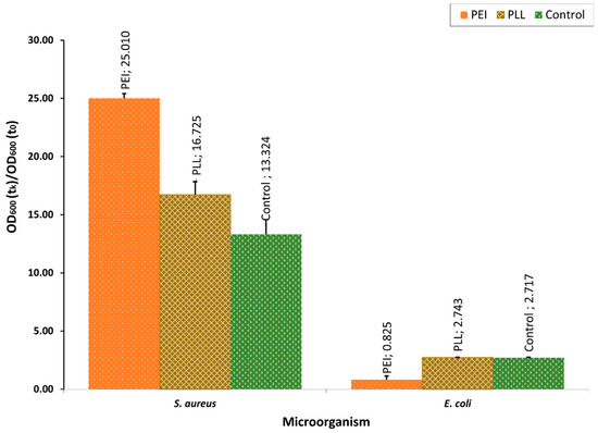 It can be seen that different materials had various effects on the investigated strains. Assessing the bacteriostatic influence of the chosen polyelectrolytes demonstrated that they did not affect the Gram (+) and Gram (−) strains to the same extent. The performed assessment showed that PEI and PLL did not induce the proliferation of E. coli. There was no statistical difference in the optical density (OD) value between PEI and PLL (p = 0.065 > 0.05). Additionally, the PEI had a bacteriostatic effect on E. coli. There was a significant difference in the optical density compared with the control (p = 0.016 < 0.05). Furthermore, the PLL did not affect the E. coli strain compared with the control (p = 0.961 > 0.05). On the other hand, it was observed that the proliferation of S. aureus strains was higher after incubation in the presence of the PLL and PEI polyelectrolytes (Figure 1). The E. coli strain, whose proliferation was not induced by the abovementioned materials, was selected for further evaluation. The lack of bacteriostatic impact on both Gram (+) and Gram (−) strains by the PLL might be caused by the weak interaction of its residues with the bacterial cell membrane.