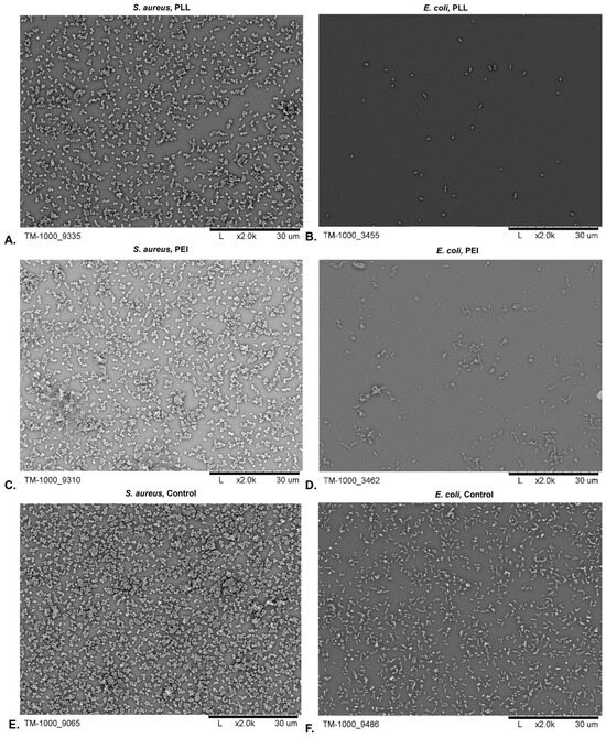SEM picture of the strains S. aureus and E. coli after a 24 h incubation in the presence of the coating layer of PLL ((A,B), respectively), PEI ((D,E), respectively), and alone ((E,F), respectively).