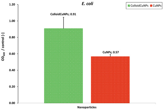 The optical density (OD) rate measured at 600 nm for the E. coli bacterial strain in the presence of the ColloidCuNPs and CuNPs compared to the control (E. coli bacterial strain cultured without additions). The values are the mean ± SD.