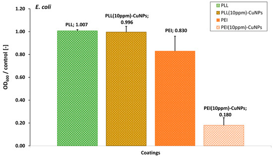 The optical density (OD) rate measured at 600 nm for the E. coli bacterial strain cultured in the presence of the PLL and PEI alone, as well as with the CuNPs-incorporated layer coatings relative to the control (E. coli bacterial strain cultured alone). The values are the mean ± SD.