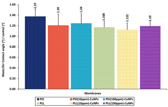The rate of water contact angle of the layer coating surface to the control (glass surface). Key to the symbols: PLL—polylysine; PLL(10 ppm)CuNPs—polylysine incorporating 10 ppm CuNPs; PLL(100 ppm)-CuNPs—polylysine incorporating 100 ppm CuNPs; PEI—polyethyleneimine; PEI(10 ppm)-CuNPs—PEI incorporating 10 ppm CuNPs; PEI(100 ppm)-CuNPs—PEI incorporating 100 ppm CuNPs. The values are presented as mean ± SD.