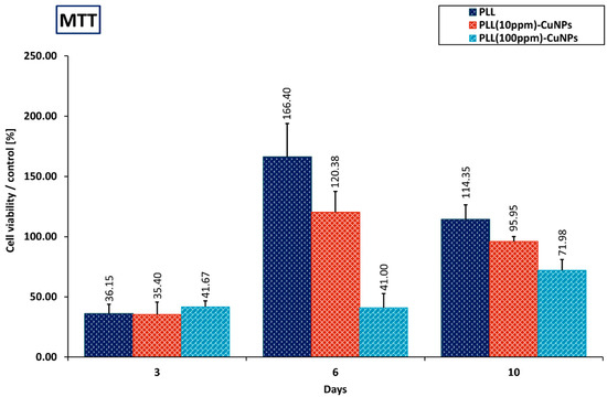 On the other hand, after 6 days of culture, the PLL and PLL(10 ppm)-CuNPs layer coatings maintained A549 cells’ function at a higher level compared with the control (p = 0.000 < 0.05, p = 0.000 < 0.05, respectively). Moreover, on the 10th day of culture, the values obtained for the layer coatings with PLL and PLL(10 ppm)-CuNPs exhibited comparable levels with the control. Nevertheless, the values obtained for the PLL(100 ppm)-CuNPs layer coating were significantly lower than the control during the whole culture period (Figure 11).