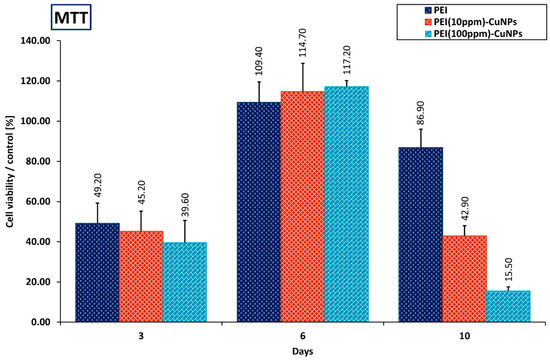 Evaluation of the mitochondrial activity of A549 cells immobilized on the PEI coating layer depicted by formazan production expressed by absorbance. The culture was maintained for 10 days. The values are presented as a ratio relative to the control (mean ± SD). Key to the symbols: PEI—polyethyleneimine, PEI(10 ppm)-CuNPs—polyethyleneimine incorporating 10 ppm CuNPs, PEI(100 ppm)-CuNPs—polyethyleneimine incorporating 100 ppm CuNPs.