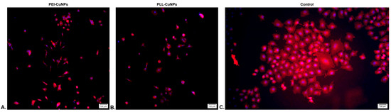 A549 cells maintained alone or in the presence of PLL(10 ppm)-CuNPs and PEI(10 ppm)-CuNPs after a week of culture. Images were obtained using fluorescence microscopy.
