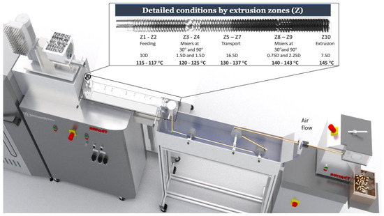 A Haake twin-screw extruder was employed, operating at a speed of 80 rpm with the following temperature profile in screw transport zones 1 to 10: 115 °C, 117 °C, 120 °C, 125 °C, 130 °C, 135 °C, 137 °C, 140 °C, 143 °C and 145 °C. After the process, the extruded biopolymer filament was cooled with air and pelletized, as illustrated in Figure 1.