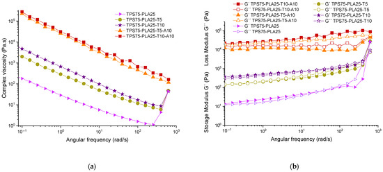(a) Log–log plots of complex viscosity (η*) versus angular frequency obtained from flow measurements conducted on TPS75-PLA25 blends. (b) Rheological data from oscillatory measurements are plotted as elastic and viscous modulus (G′ and G″) versus oscillatory frequency.