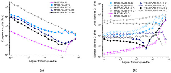 (a) Log–log plots of complex viscosity (η*) versus angular frequency obtained from flow measurements carried out on blends prepared TPS50-PLA50. (b) Rheological data from oscillatory measurements plotted as elastic and viscous modulus (G′ and G″) versus oscillatory frequency.