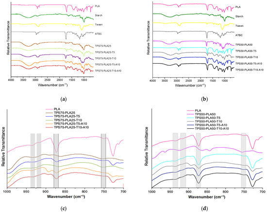 The infrared spectrum (Figure 5a,b) illustrates the characteristic bands of functional groups and bonds contained in the polymer chains of the mixed compounds. In the highest energy zone, O–H hydroxyls appear around 3280 cm−1, related to carbohydrates (amylose and amylopectin), the foundational structures of starch [28]. At 2920 cm−1 and 2840 cm−1, asymmetric and symmetric stretching of C–H is observed. The carbonyl vibration (C=O) corresponding to the structure of PLA and ATBC is recognized at 1720 cm−1 [20]. Likewise, at 1736 cm−1, the carbonyl of the ester in the Tween structure, related to the unsaturated chain (hydrophobic part of the amphiphilic molecule), is identified. A band at 1640 cm−1 corresponds to absorbed water. In the ether zone, at 1375 cm−1, 1398 cm−1, and 1404 cm−1, the positions of the O–C–O symmetric stretching modes are exhibited [29]. Subsequently, dialkyl ethers of the glucopyranose ring (C–O–C) and C–O are found at 1150 cm−1 and 1018 cm−1, respectively. In the lower-energy zone (Figure 5c,d), vibration bands for amorphous and crystalline PLA microstructures are found at 875 cm−1 and 752 cm−1, corresponding to out-of-plane bending vibrations of the γC=O bond [30]. In the latter, the band of the crystalline phase decreases significantly in the different mixtures functionalized by the plasticizer and surfactants, disrupting the crystalline structure of neat PLA. Other bands between 920 cm−1 and 960 cm−1 also indicate rearrangement due to the interaction of PLA with other components, revealing the rocking vibration modes of -CH3 [31]. Mixtures containing the plasticizer show a decrease in the OH band compared to the corresponding blanks TPS75-PLA25 and TPS50-PLA50. In previous works, strong interaction with Tween has been discussed; however, the presence of ATBC in high concentrations (TPS75-PLA25-T10-A10) shows an adverse effect on the interaction by exhibiting greater freedom of the hydroxyl bond (OH) at 3280 cm−1. The limitations observed in mixtures where starch predominates (TPS75-PLA25) result from the limited movement of -OH due to interactions promoted between the components in mixtures with equal concentrations of these biopolymers. The area related to glycosidic linkage varies notably in the spectrum between ~1480 cm−1 and ~1330 cm−1, widening due to multiple interactions connected by hydrogen bonds (C-O•••H) with the hydroxyls of the other components. In general, the TPS–PLA blends, plasticized and homogenized with Tween and ATBC, show an additional band at 1585 cm−1 corresponding to the carbonyl group, a product of the formation of new esters, differentiable from the reagents or starting compounds. According to reports by some authors, ester derivatives can exhibit diverse chemical environments that dramatically modify the displacement of the carbonyl group. In this case, the systems are favored by showing bands at lower wave numbers. The ether zone corroborates these changes by displaying greater intensity in the bands between 1150 cm−1 and 1018 cm−1.