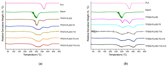 Figure 6a,b show the curves derived from the thermogravimetric analysis (DTG) of the modified TPS–PLA mixtures. The thermograms display curves with two significant weight loss stages proportional to the biopolymer content in the mixture. Additionally, minor variations of less than 10% weight loss, related to the partial evaporation of plasticizers (water and glycerol), were identified in the temperature range between 50 °C and 180 °C. It is observed that another portion of plasticizers is released after the degradation of starch, due to stronger interactions that have managed to encapsulate or form crystallization waters. The permanence of involved solvents (plasticizers and surfactants) is of great importance in homogenizing the mixture. This behavior has also been observed by other authors [19,32,33].