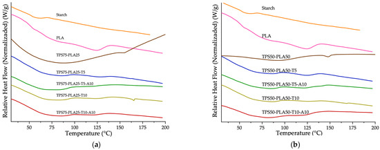 Figure 7 presents the results of differential scanning calorimetry (DSC) for the mixtures, showing two second-order transitions in the temperature range of 50 °C to 70 °C, which can be corroborated in the starting compounds. In the case of starch, a gelatinization temperature (Tgel) is observed once it is mixed with the plasticizers (water and glycerol), and for PLA, the glass transition temperature (Tg) is 64 °C. It is important to mention that the widened band due to Tgel overlaps with the Tg of PLA, limiting the comparative analysis between the samples that consider this parameter. The first-order transitions occur around 120 °C and 160 °C due to the fusion of TPS and PLA, respectively. The 75:25 and 50:50 TPS–PLA blends proportionally show the intensity in the absorption endotherm of the second-order transition. Once the plasticizers are incorporated, a significant increase in peak temperature between 15 °C and 20 °C is observed. The presence of ATBC radically modifies the molecular structure, imprinting a greater degree of disorder that is evidenced by the decrease in intensity of the melting point of PLA.