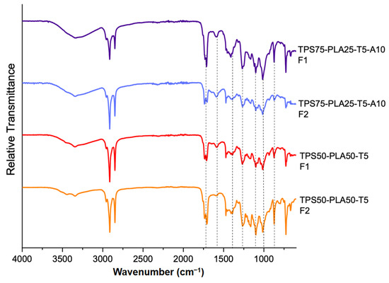 The infrared analysis of the films, selected based on the extrusion processing parameters, allowed for the evaluation of interaction and stability between the components during two thermomechanical processes. In the case of films, infrared analysis was conducted on each side of the film, identified as F1 and F2 (see Figure 8). This sampling approach was maintained for other physical analyses, such as water vapor permeability and contact angle. The F1 and F2 spectra of the TPS50-PLA50-T5 film exhibited minimal differences, with an increase in the band corresponding to C–O around 1100 cm−1 for F2. This increase in intensity is attributed to the greater presence of Tween. However, the polymers remain in a mixture. For TPS75-PLA25-T5-A10, F1 displayed pronounced PLA bands, while F2 predominantly showed the TPS bands discussed in Section 3.2.