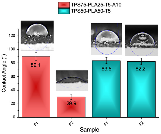 Figure 9 displays the contact angle values represented in bar graphs obtained from the wettability analysis. This characterization was conducted on both sides of the film to assess the surface behavior of the polymer mixture concerning humidity. The TPS75-PLA25-T5-A10 F1 sample exhibited limited hydrophilicity with an average value of 89.1°, while the opposite face (F2) presented a value of 29.9°, making this surface highly hydrophilic. This allowed water interaction with the material through hydrogen bonds with starch hydroxyls. This observation aligns with the infrared analysis, indicating a distribution of components between F1 and F2, identifying PLA and TPS, respectively. The flat film extrusion process resulted in the orientation of PLA polymer chains towards F1 and TPS towards F2. Although evident in slower processes like solvent casting (taking minutes), faster processes such as molding, extrusion, or injection (taking seconds) might limit molecular mobility [35], forcing interactions before the initial mixing. For the TPS50-PLA50-T5 film, no significant difference in humidity behavior was observed on different sides of the film, with angles of 83.5° and 82.2° for F1 and F2, respectively. This result aligns with the infrared analysis, indicating a combination of TPS and PLA polymers. The stability of the mixture, facilitated by the presence of the surfactant and polymer proportions, supports a homogeneous system. The orientation of starch and PLA caused by the surfactant is evident in the film conformation, with one surface appearing darker (starch) and the other white (PLA), as observed in photographs taken on both surfaces of the films (Figure 9).