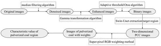 The approach developed in the present work is illustrated by the flow chart in Figure 1. First, original images of the tuyere from a CCD camera are preprocessed. Filtering techniques and the Gamma transformation (GT) algorithm are applied to denoise and enhance the tuyere images, respectively. A binary graph of the pulverized coal cloud is then obtained by utilizing the adaptive Otsu thresholding method, which maximally preserves the edge details. The Swin–Unet model is used to segment the pulverized coal cloud, and the obtained regions are processed using the RGB super-pixel weighting method to generate a weighted image of the coal dust cloud. Finally, the combustion state index of the injected coal is quantified based on the results.
