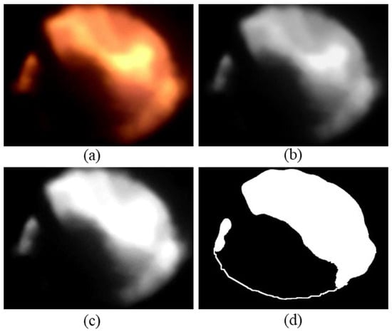 (a) Original image from some tuyeres; (b) binary images; (c) cloud region detection; (d) extraction of pulverized coal cloud.